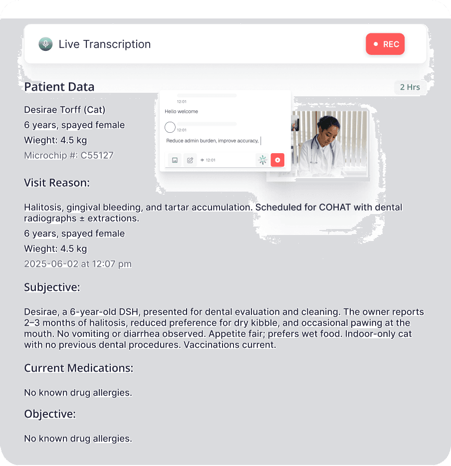 Claio Pets is an AI scribe that listens as you work and turns your conversations into clean, complete medical notes.